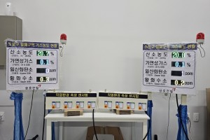 산소, 일산화탄소, 가연성가스, 메탄 산업안전보건법에 작업자 밀폐공간 등의 설치하여 실시간으로 표시하고이상 수치 시 경광등외 알림 출력합니다.